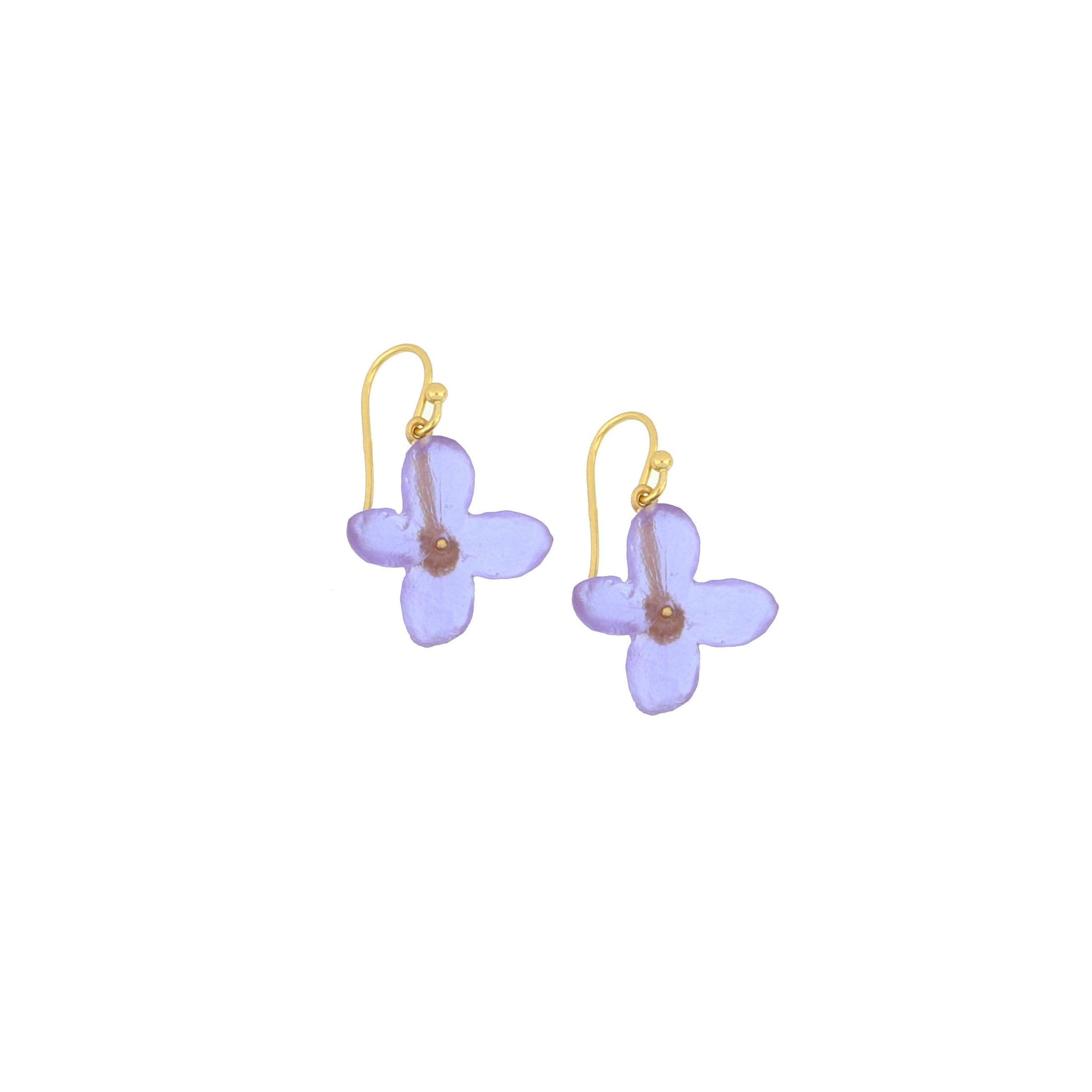 The Hydrangea Collection is cast in bronze layered in 24K Gold with cast leaf green glass elements.  Sterling silver ear wire layered in 24k Gold.