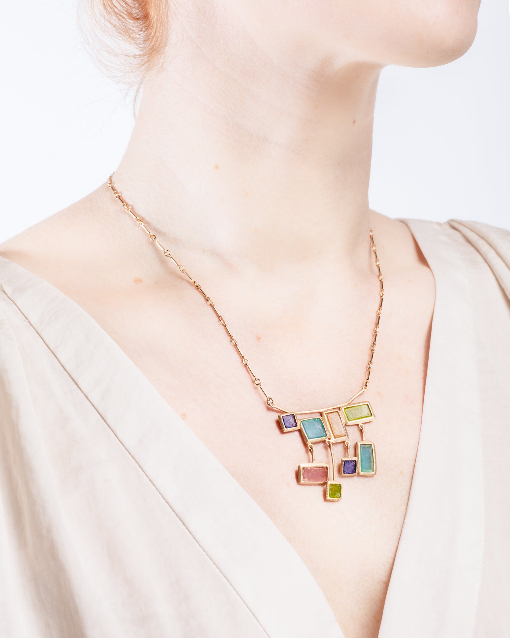 Michael’s work is notably unique in his process of cast glass, a technique not typically utilized in jewelry. Michael is able to capture bold colors and textures that make each jewelry design pop in glow with the glimmer of forever changing lights that hit the glass elements.