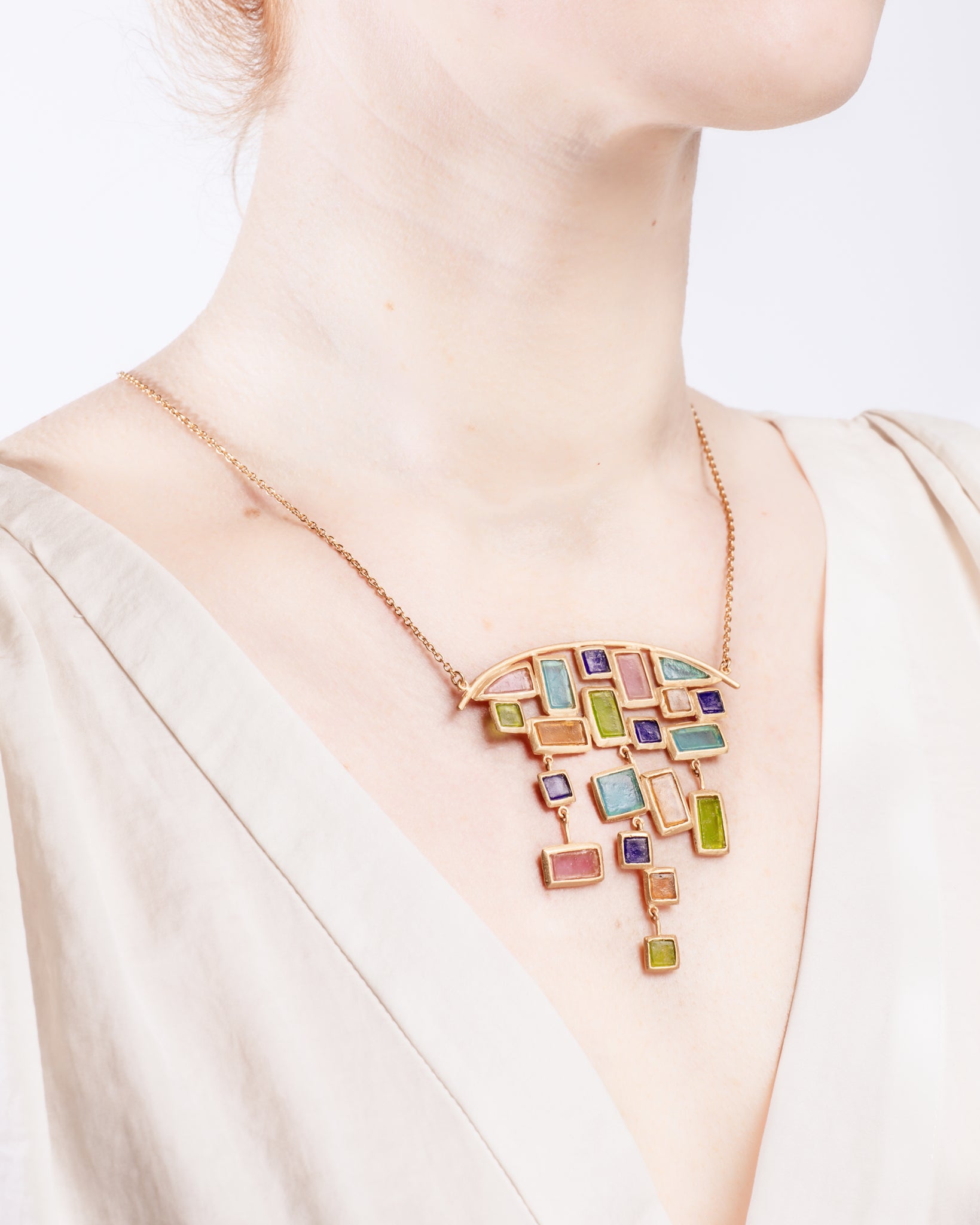 This collection was inspired by the way light strikes beautiful, glass mosaic windows and creates a kaleidoscope of color. The cascading, delicate glass pieces all glow in harmony when hit with radiant sunlight.