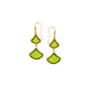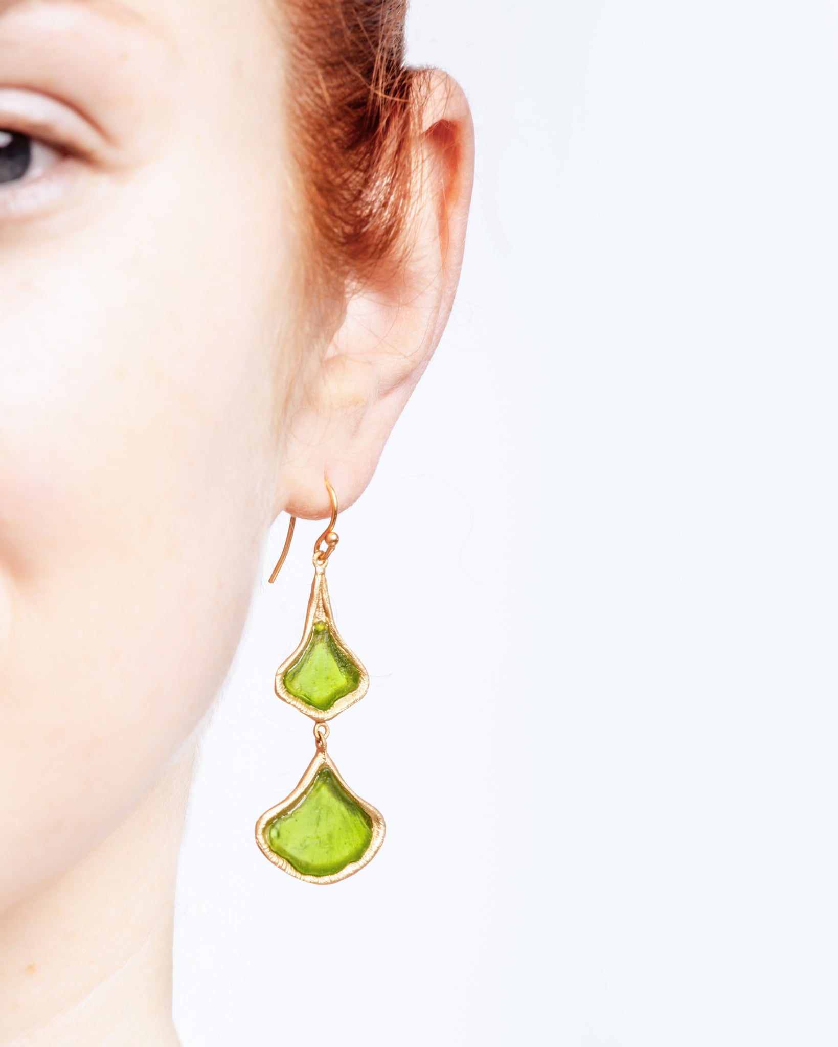The Gingko Collection is cast in bronze layered in 24K Gold with cast leaf green glass elements.